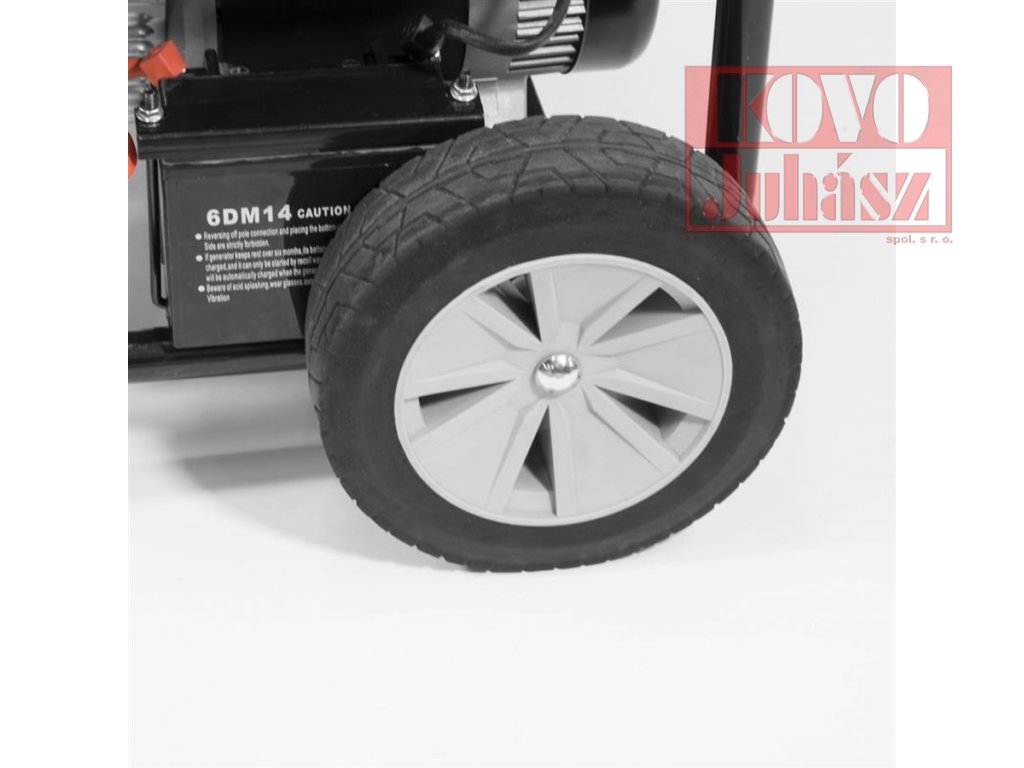 Konstrukce: přehledný ovládací panel, ochranný trubkový rám, sklopná přepravní rukojeť, velká pojezdová kola.