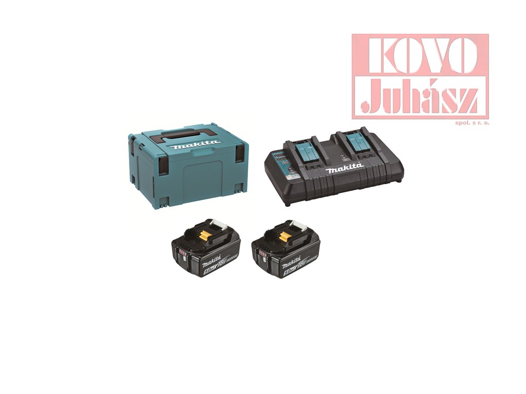 Nové sady akumulátorů Li-ion 18V/5,0 Ah s dvojitou nabíječkou a systainerem. Součástí dodávky jsou dva 18V akumulátory 5,0 Ah, dvojitá rychlonabíječka DC18RD a systainer Makpac.