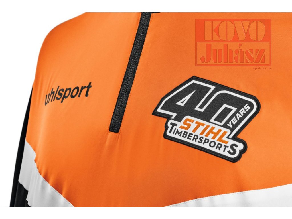 Černooranžová mikina oslavující 40. výročí značky TIMBERSPORTS® v retro stylu 80. let. Na přední straně hrudi je natištěn výroční odznak a logo sponzora Uhlsport.